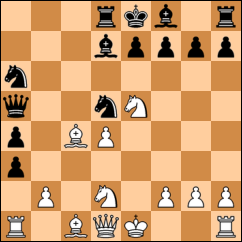 Ik keek hier naar 15.Pxf7 Kxf7 16.Df3+ maar na 16…Kg8 17.Lxd5+ e6 leek me dat niet zo duidelijk. Veel sterker is echter 16.Dh5+ g6 17.Lxd5+ Kg7 18.De5+ en zwart kan opgeven. Ook 15.Df3 was een optie die ik overwoog, maar ik dacht dat hij dan nog kon verdedigen met 15…Le6. Dan wint wit echter met 16.Pc6. Enfin, ik rokeerde, en na 15.0-0 e6 16.Dh5 (16.Df3 +-) g6 17.Df3 f5 18.Te1 Le7 19.Pxd7 Txd7 20.Txe6 Pac7 21.Te2 0-0 was ik van plan 22.La2 te doen, maar onderbreking van de arbiter voorkwam dat: mijn tegenstander was (ondanks het Fischer-tempo met 10 seconden per zet erbij) door zijn vlag gegaan. Ik dacht dat ik in de slotstelling nog heel goed stond, maar volgens de computer zou het voordeel na 22.La2 grotendeels verdwenen zijn. Waarschijnlijk had ik met ogen open toch een stuk meer gezien (pun intended).